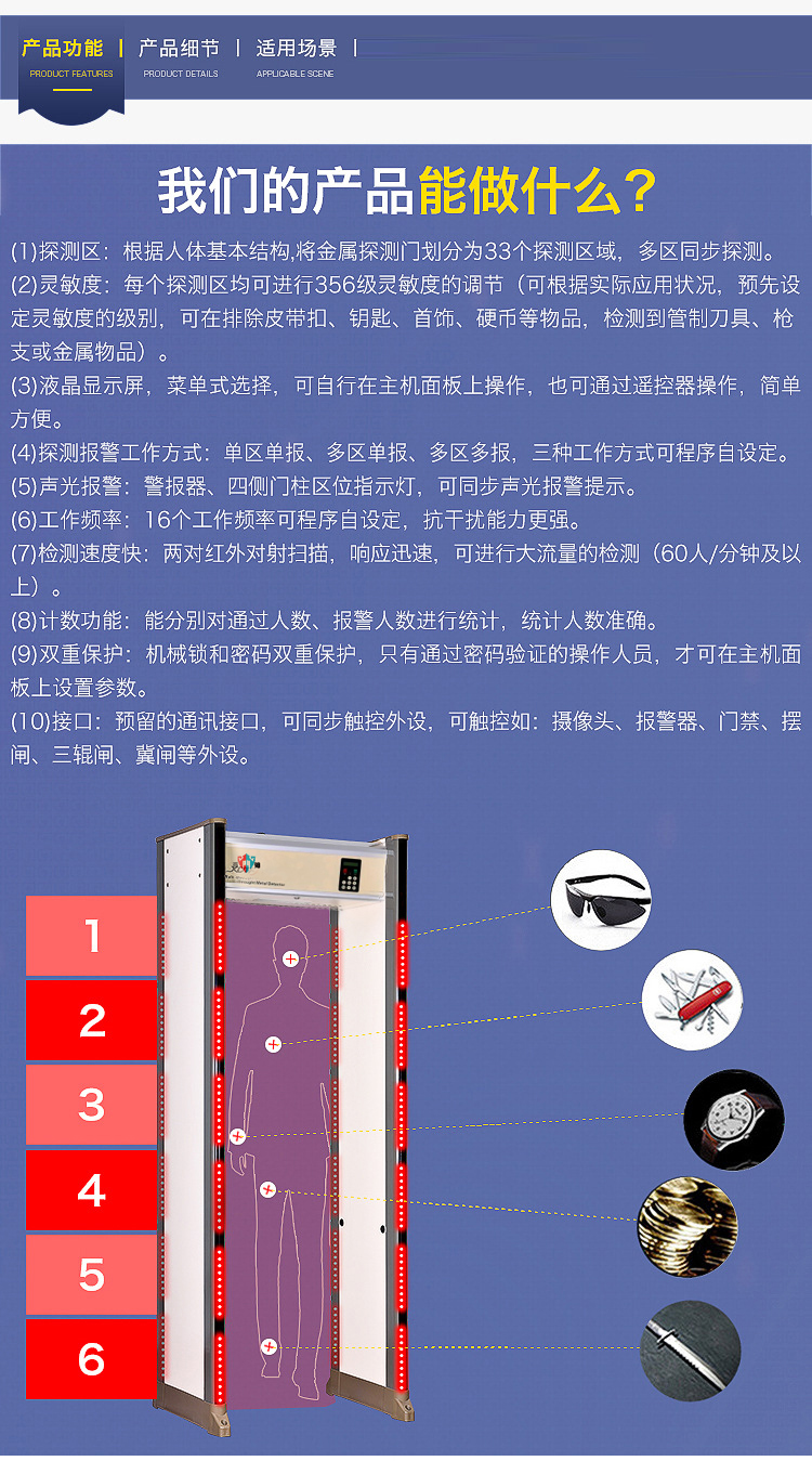 (2)、靈敏度:每個(gè)探測(cè)區(qū)均可進(jìn)行356級(jí)靈敏度的調(diào)節(jié)(可根據(jù)實(shí)際應(yīng)用狀況,預(yù)先設(shè)定靈敏度的級(jí)別,可在排除皮帶扣、鑰匙、首飾、硬幣等物品,檢測(cè)到管制刀具、槍支或金屬物品)。