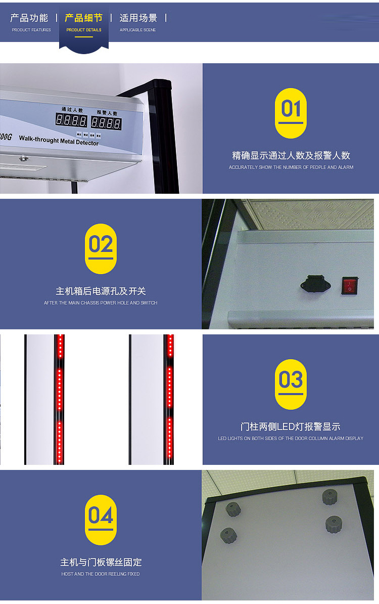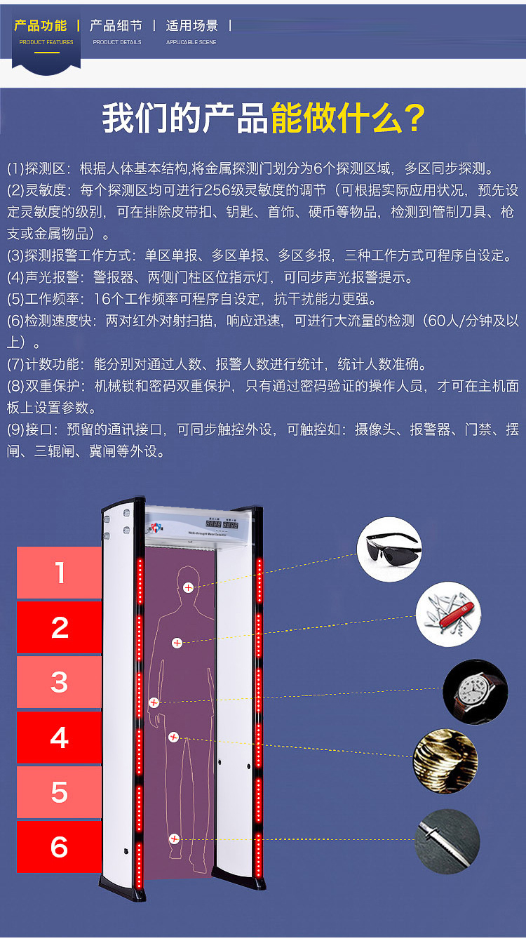 看門神 KMS-600G安檢門(6區(qū))采用電磁兼容設計和抗震動設計,具有高靈敏度、強抗干擾能力和強抗震能力,適用于管制刀具和槍支等危險物品的安全檢查,廣泛應用于監(jiān)獄、法院、學校、醫(yī)院、電子企業(yè)、港口、客運站、展覽會館、會議中心、重大慶典、演唱會等重要場所。