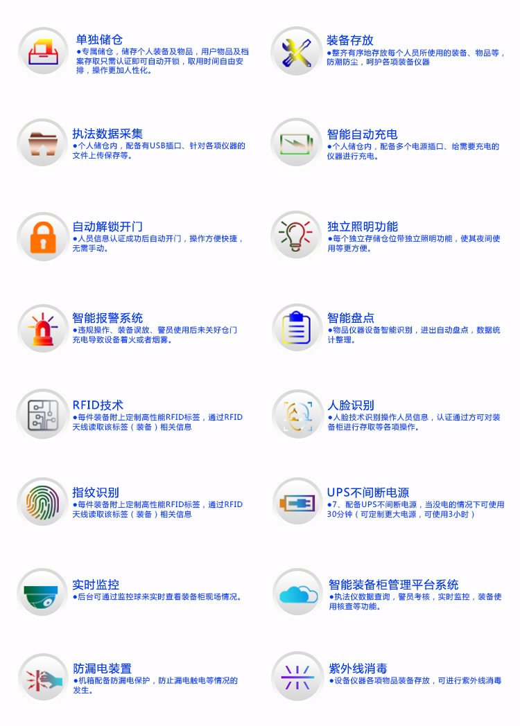 KMS-FB20智能單警裝備柜系統(tǒng)集合裝備柜管理、人員管理、裝備存儲、裝備充電、自動盤點、智能報警等多功能于一體;實現(xiàn)了裝備管理的規(guī)范化、流程化、可追溯等特點。