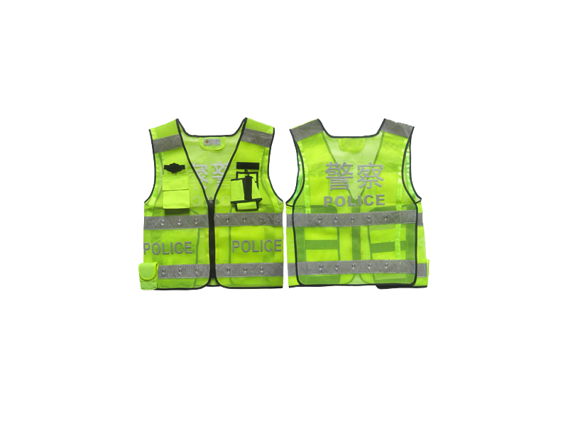 材質(zhì):熒光黃眼布反光帶:5cm晶格反材料,反光帶上鑲嵌LED燈,前擺兩側(cè)、后背反光字采用燙印工藝,前擺兩側(cè)分別印有“POLICE”,后背印有“警察POLICE”。