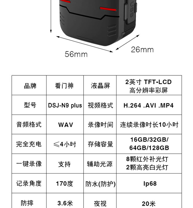 9.紅外燈及夜視: 7顆紅外燈。10米可見人臉,20米可見人體輪廓。