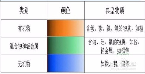在顏色模式下、有機(jī)物顯示為不同的橙色和黃色、無(wú)機(jī)物顯示深淺不同的綠色、高密度物品顯示為黑色和深紅色。