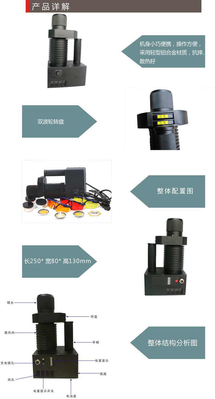 KMS-BA 手持式十三波段光源采用一體化設(shè)計(jì),主機(jī)內(nèi)置大容量電池組及段質(zhì)增透膜濾光片,雙波輪轉(zhuǎn)盤,機(jī)身小巧便攜,操作方便,采用輕型鋁合金材質(zhì),抗摔、散熱好。直流供電,可以選配備用鋰電池組,延長了沒有220V交流電工作時(shí)間,達(dá)160分鐘以上,余電顯示。 55W高亮度HID氙燈,燈泡壽命長,是理想的現(xiàn)場勘察設(shè)備。